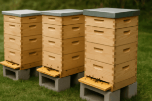 Manter a colmeia elevada, a pelo menos 30 cm do solo, usando blocos, cavaletes ou bases de madeira, o que reduz o risco de umidade e facilita o manejo.